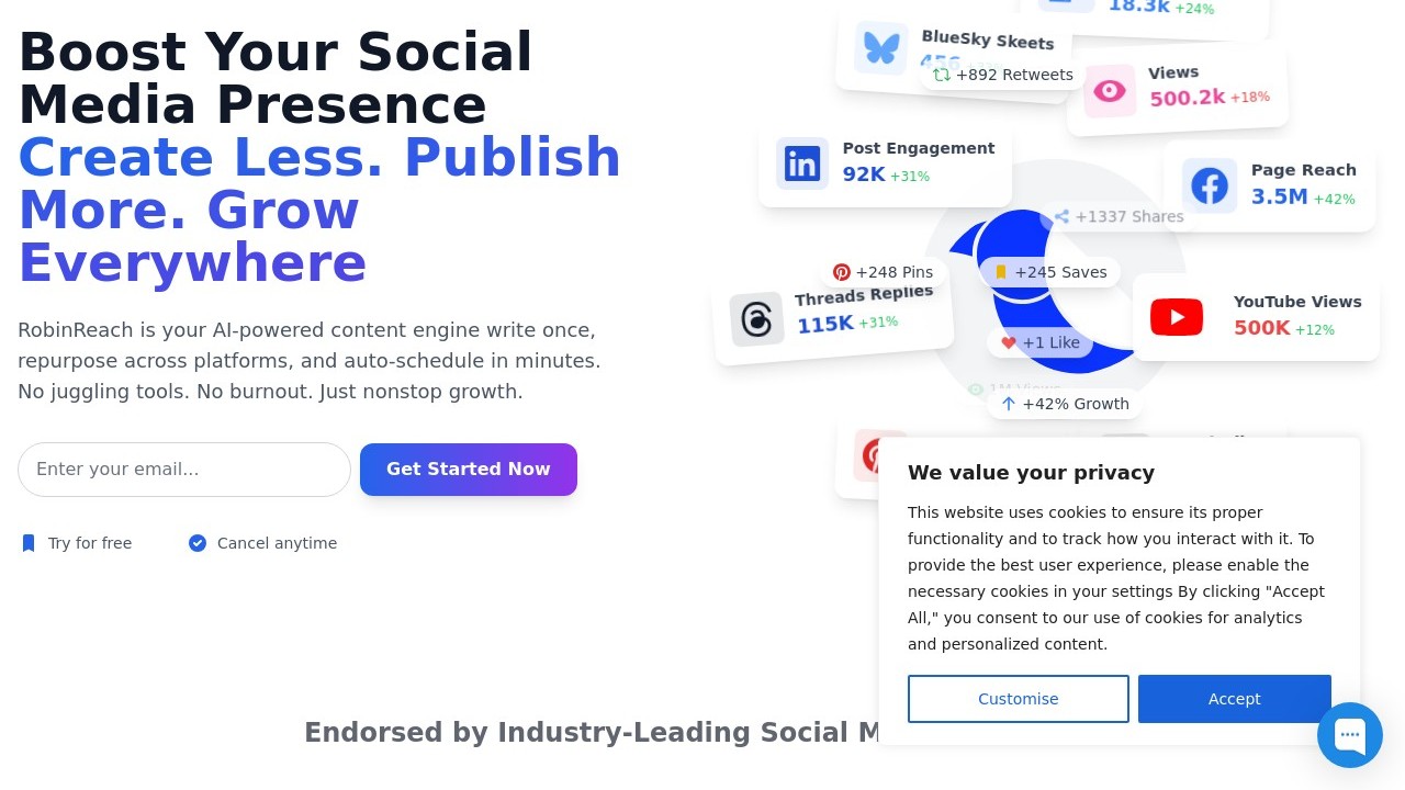 RobinReach is a tool for managing social media that simplifies the scheduling of content, engaging with audiences, and tracking performance across various platforms. It caters to businesses, marketing teams, and individuals aiming to enhance their social media impact. With a unified dashboard to oversee multiple accounts, automate post scheduling, and deliver analytics, RobinReach assists users in saving time, ensuring consistency, and making informed decisions to refine their social media strategy and online presence.