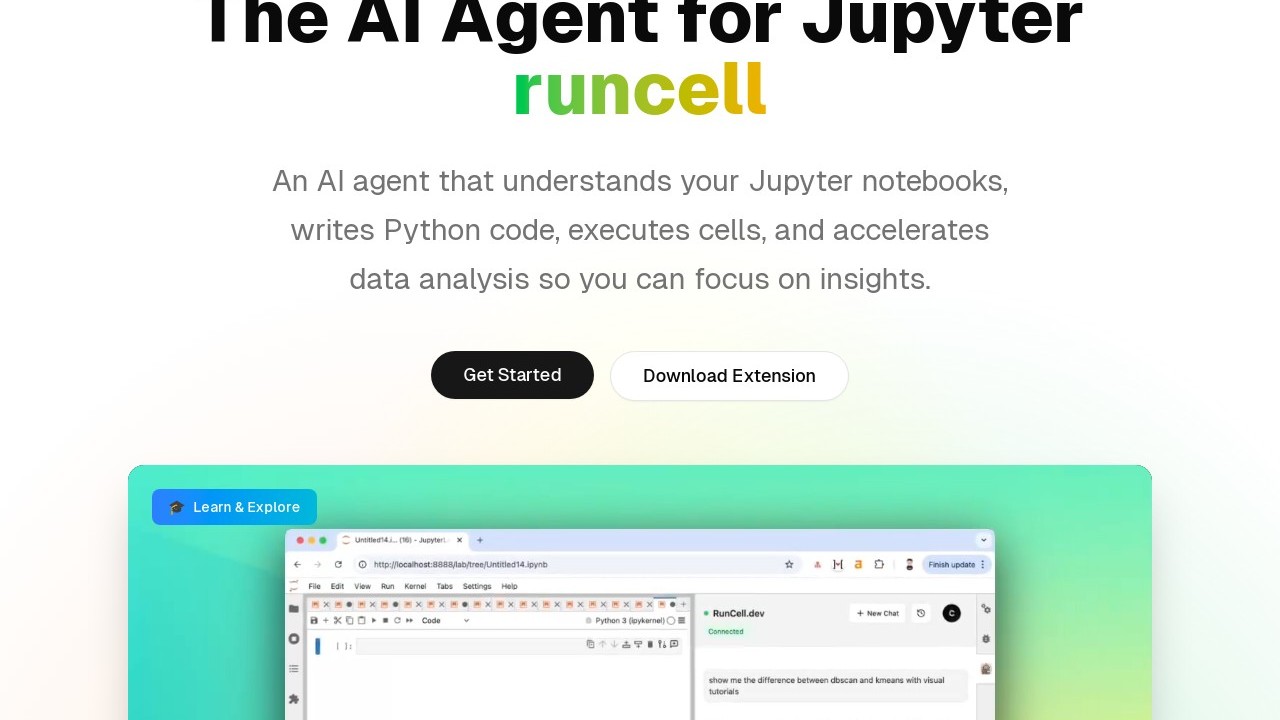 RunCell is an AI-driven assistant seamlessly incorporated into Jupyter notebooks, allowing users to create and run code using natural language commands instead of manual coding. This tool revolutionizes the data analysis process by allowing data scientists, researchers, and developers to simply state their objectives, and then RunCell generates and executes the necessary code automatically. By introducing conversational AI features to the notebook setting, RunCell greatly cuts down coding time, reduces the technical entry barrier for newcomers, and aids seasoned programmers in quickly prototyping ideas. It enables users to concentrate on their analytical objectives rather than syntax intricacies, thus making complex data tasks more approachable and simplifying the experimental workflow for anyone using data in Jupyter contexts.