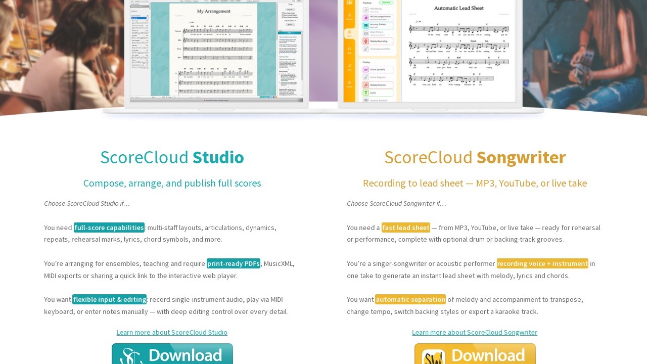 ScoreCloud is a music notation program that transforms music into sheet music, designed for musicians, students, teachers, choirs, bands, composers, and arrangers. It offers audio and MIDI transcription, robust editing tools, various output formats, and cross-device synchronization. The ScoreCloud Express mobile app for iPhone and iPad enables users to jot down musical ideas on the go by singing, whistling, or humming a tune or baseline into the app. Furthermore, ScoreCloud provides three subscription plans with different feature levels.