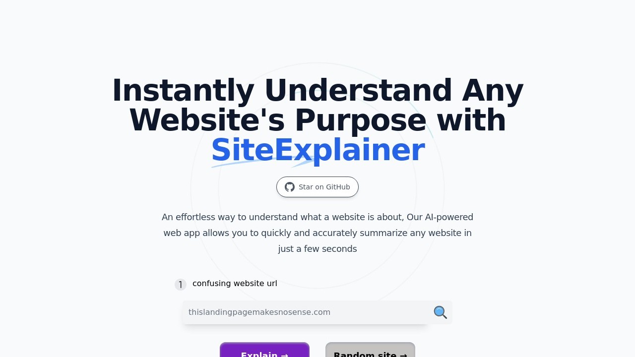 SiteExplainer is a web application driven by AI that clarifies and condenses complex landing pages and business jargon found on websites. Leveraging cutting-edge artificial intelligence and machine learning technology, it swiftly and effortlessly interprets a website's content into a clear and accessible format. SiteExplainer is available at no cost and can simplify any site, handling intricate language, corporate jargon, and perplexing landing pages. It works on both desktop and mobile platforms and welcomes sponsorships and donations to help sustain the project.