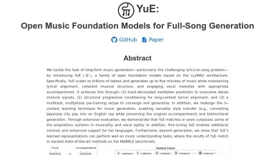 YuE is an open-source foundation model series crafted for music creation, focusing on converting lyrics into entire songs. It generates full tracks encompassing both vocal and instrumental components. The model accommodates various languages, genres, and vocal styles, making it a flexible tool for AI-driven songwriting. Additionally, YuE offers an inference mode that lets users create music in a style akin to a reference track. It supplies different model versions, including unique upsampling models for enhanced audio quality. Users can explore demos to experience its vocal performance and keep informed about continual improvements.
