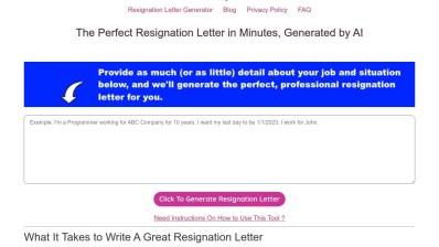 The site offers an AI-Powered Resignation Letter Generator designed to assist users in crafting the ideal resignation letter. Additionally, it provides useful guidance on composing a professional resignation letter, alongside resources such as sample resignation letters and tutorials on how to write one.