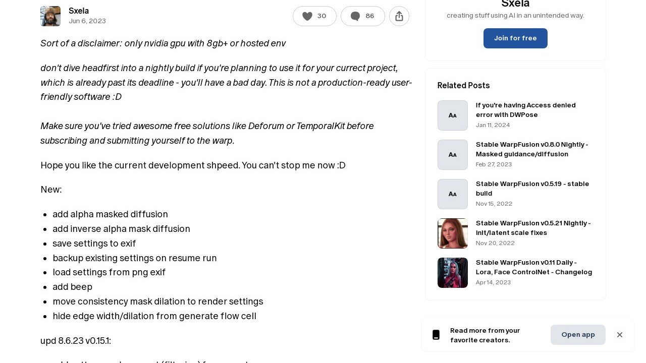 Stable WarpFusion is a GPU-powered diffusion tool with alpha masking, allowing users to generate intricate and lifelike imagery through artificial intelligence. It includes features like a novel consistency algorithm, Tiled VAE, Face ControlNet, Temporalnet, and Reconstruct Noise. The tool can be downloaded nightly, and different support levels are offered through Patreon.