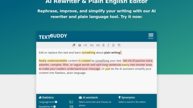 Textbuddy's Plain English Text Analyzer is a complimentary tool designed to enhance writing by examining text and highlighting parts that may need to be clearer or more succinct. It includes features like grammar and spelling checks, detection of passive voice, complex words, fillers, vague terms, and formatting errors, as well as offering synonym suggestions, sentiment analysis, keyword density calculation, and readability scoring. Additionally, it features an AI assistant to aid with grammar and spelling, create headlines and summaries, rewrite in plain English, and assess text sentiment.
