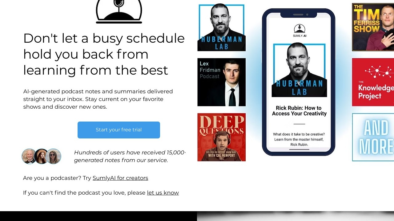 SUMLY.AI is an AI-driven platform offering precise and brief summaries of audio and video content. It helps busy people save time and stay updated on their favorite programs while exploring new media. The summaries are created with advanced AI technology and verified by humans for superior quality. Users receive these summaries in their inboxes within 24 hours. Currently, SUMLY.AI is entirely free and does not have any adverts or hidden subscription costs.