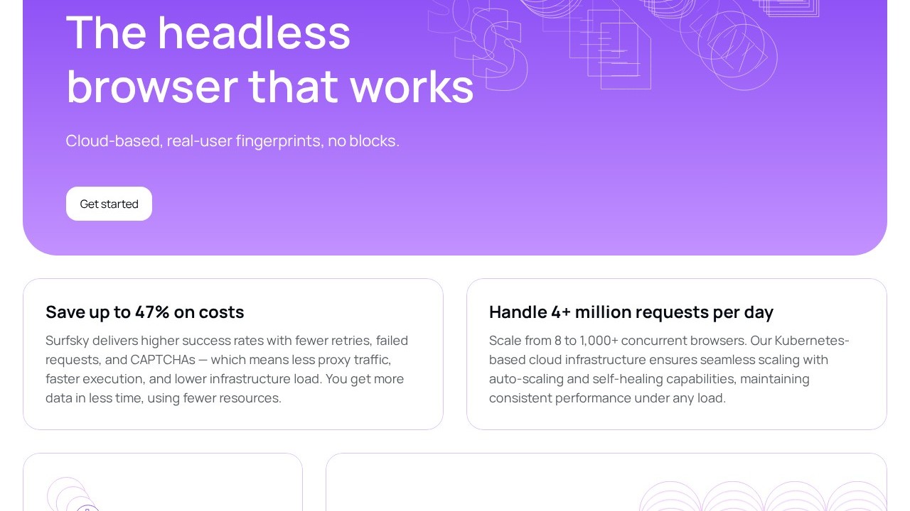 Surfsky is an online browser automation solution that offers discreet web automation and data extraction via its unique Chromium-based browser equipped with advanced fingerprint spoofing technology. The platform allows users to effectively circumvent intricate anti-bot systems, automatically solve CAPTCHAs, and scale from one to thousands of simultaneous browsers. Enterprises, developers, researchers, and marketers may opt for Surfsky due to its high success rates on secure websites, affordability relative to conventional solutions, and smooth integration with popular automation frameworks such as Playwright and Puppeteer, especially when they require dependable data gathering, lead generation, price tracking, or the automation of repetitive web activities.