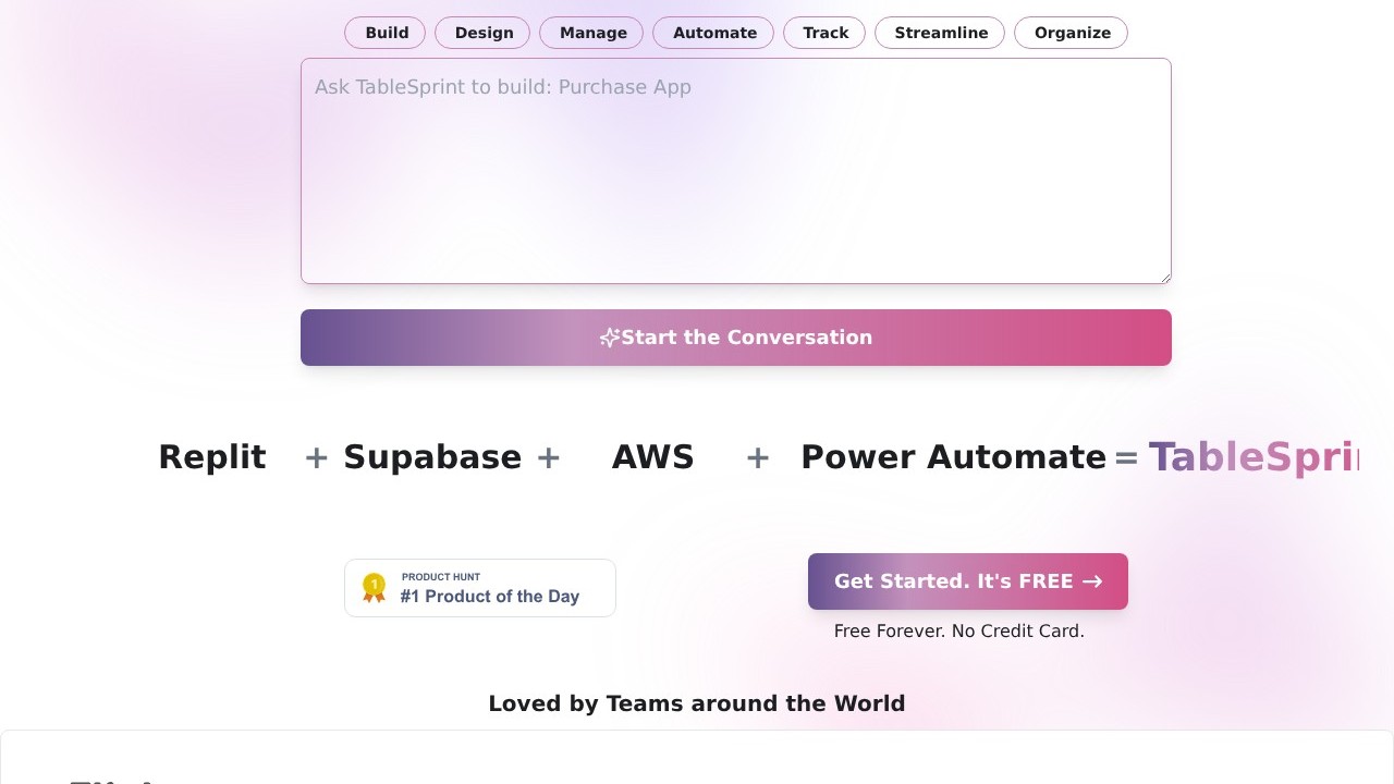 TableSprint is a platform driven by AI that allows users to build personalized business applications without needing coding skills. Featuring an Excel-like interface, it provides pre-designed templates, forms, and integrations for various business operations. Users can efficiently create customized solutions for activities like managing sales, HR processes, and inventory monitoring. Designed for small business proprietors, non-technical teams, and large enterprises, TableSprint helps streamline workflows and enhance efficiency across multiple departments without requiring significant technical resources or programming knowledge.