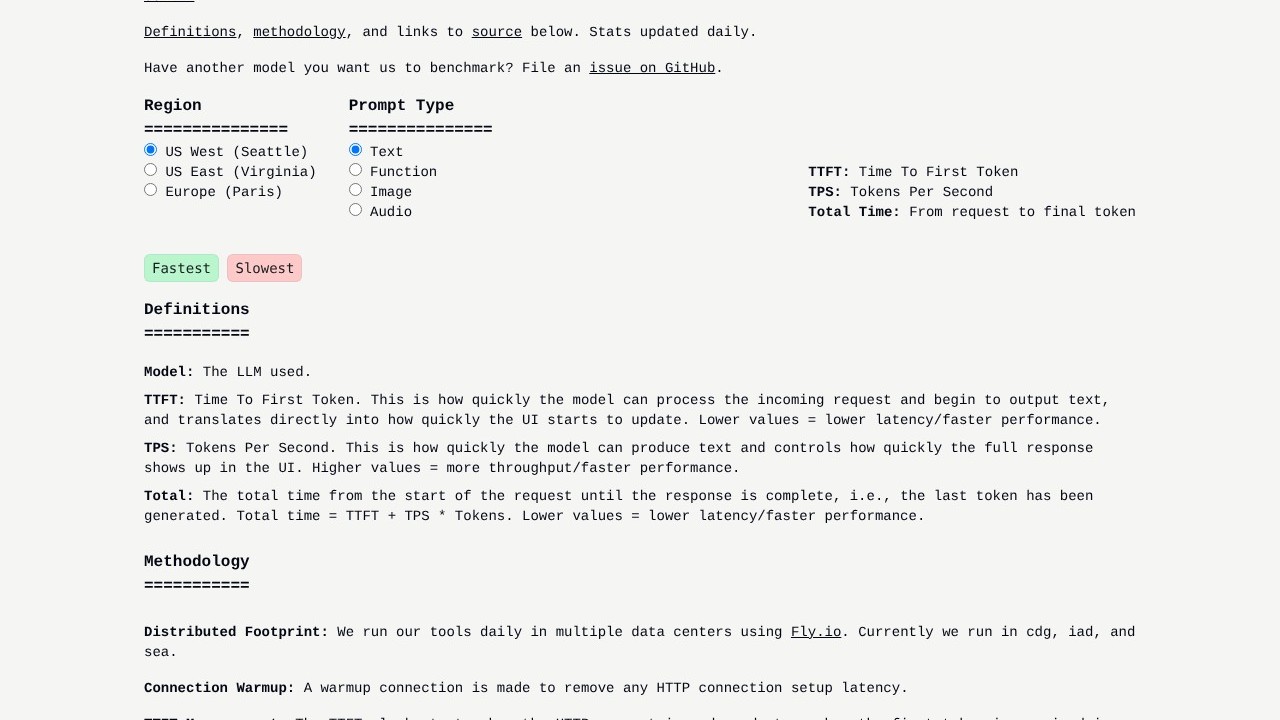 TheFastest.ai serves as a benchmarking tool for evaluating and comparing the performance of various large language models (LLMs), with a focus on metrics like Time To First Token (TTFT), Tokens Per Second (TPS), and total response time. By offering daily updated statistics on how swiftly these models can handle requests and produce text, the tool is essential for developers and businesses aiming to enhance conversational AI interactions, ensuring their applications deliver rapid and smooth user experiences. Users might utilize TheFastest.ai to make informed choices about which LLM to incorporate based on performance, to track the speed of their chosen models over time, or to compare the effectiveness of different models for particular use cases or regions.