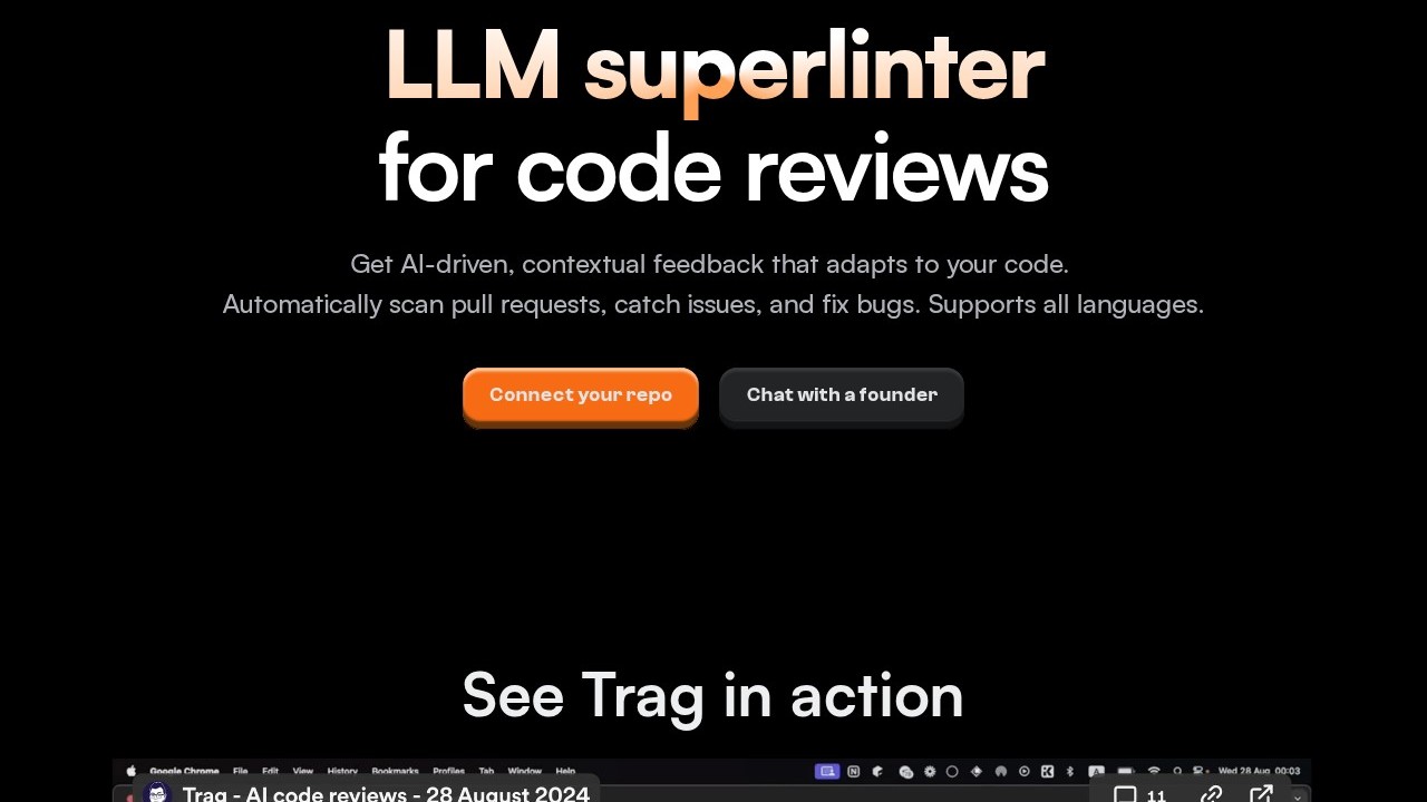 Trag is an AI-driven code review tool aimed at helping engineering teams save time and enhance code quality. It enables users to establish custom rules using natural language, which allows Trag to automatically review pull requests, detect bugs, and propose corrections with AI-driven autofixes without directly altering the codebase. It supports multiple repositories and ensures adherence to best practices like memory management, DRY principles, and secure coding. Teams may choose to utilize Trag to optimize their review workflow, uphold coding standards, and decrease the time developers dedicate to reviewing code, allowing them to concentrate more on product development.