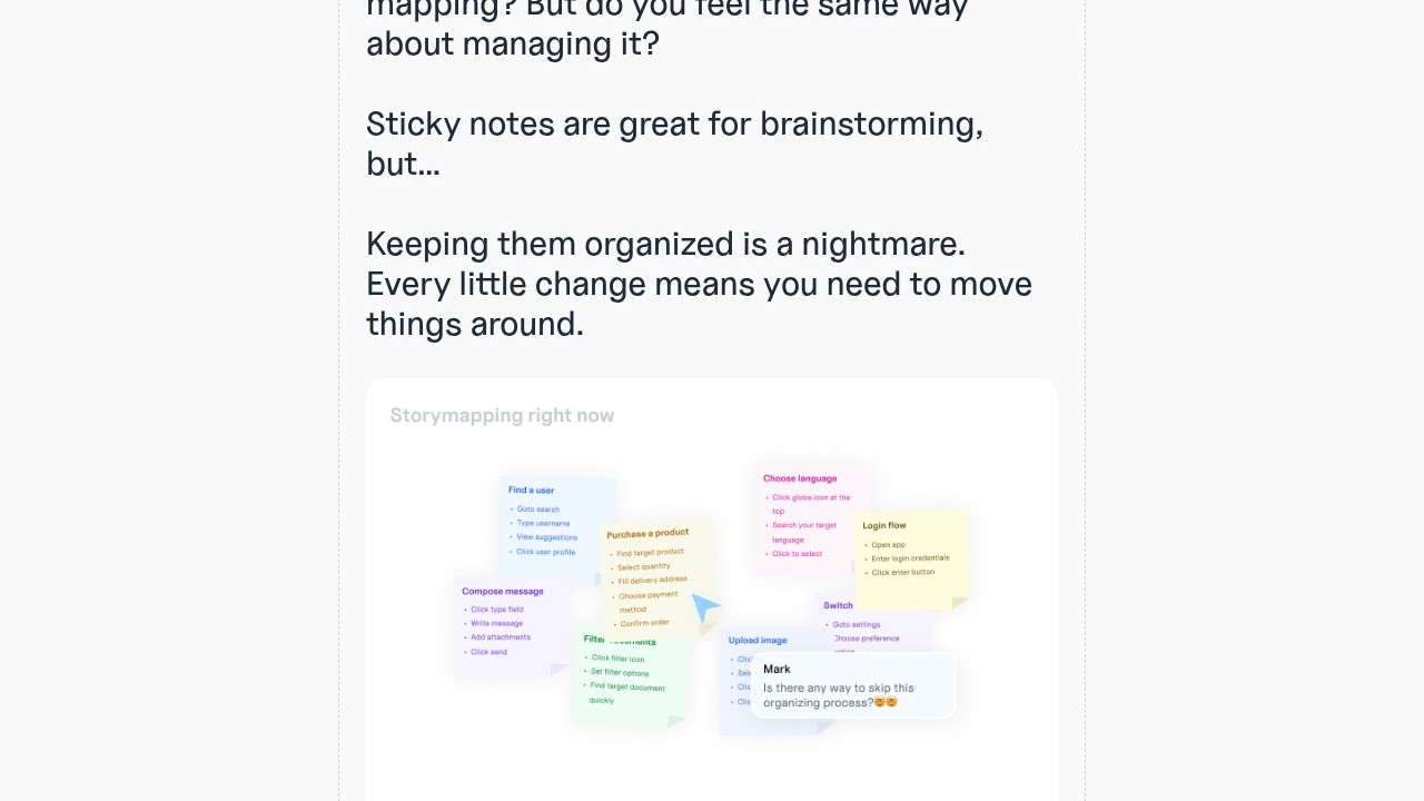 Uiino is a story mapping tool that streamlines the creation and management of user story maps by enabling designers to construct these maps in plain text, either manually or with the assistance of an AI-powered Storymapper. This novel method removes the clutter of physical sticky notes and the challenges of traditional digital tools by offering a user-friendly, text-based system with clear tags for easy comprehension, built-in version control for monitoring changes, and an emphasis on collaboration. Designers and product teams might favor Uiino for its simplicity, which helps in visualizing the user journey and shaping a clear product roadmap without the distractions of complex software.