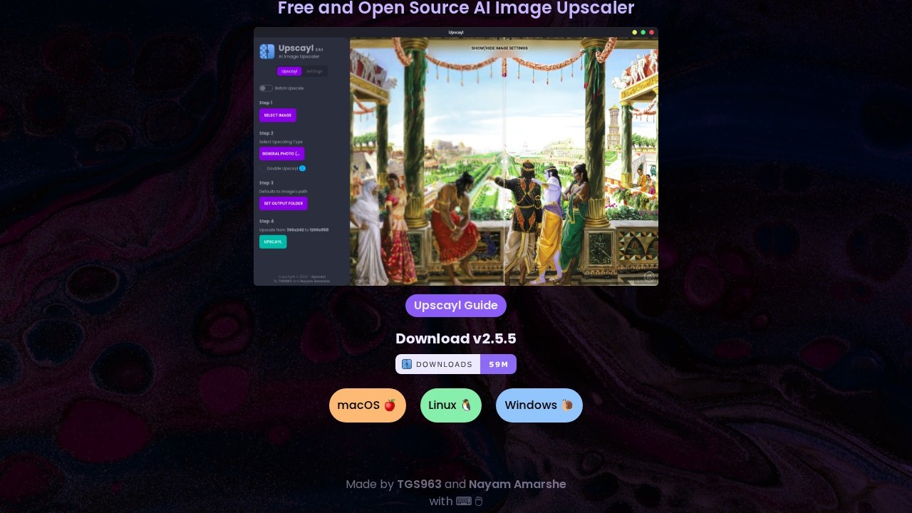 Upscayl is an open-source AI image upscaler available for free, compatible with MacOS, Linux, and Windows. Developed by TGS963 and Nayam Amarshe, it can be downloaded from GitHub.