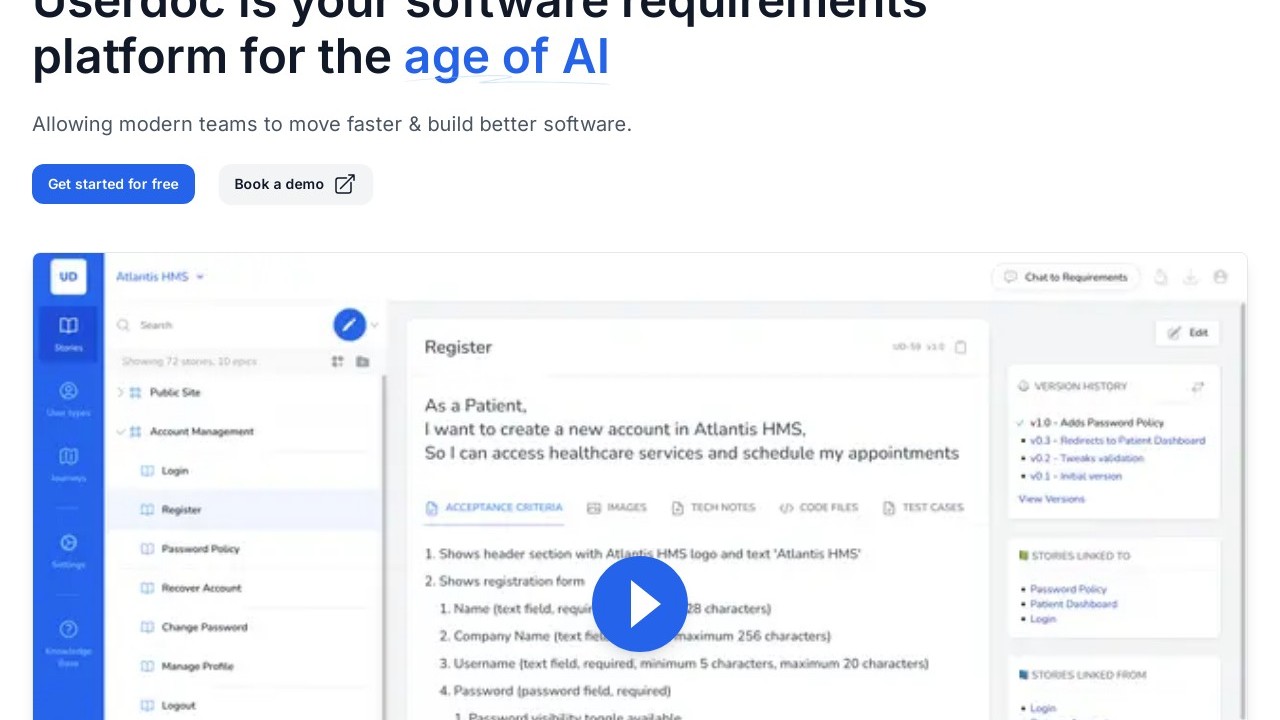 Userdoc is a contemporary tool for managing requirements, designed to assist users in capturing, organizing, and overseeing their system requirements efficiently. It includes AI assistance to significantly reduce the workload, alongside functionalities such as user stories, user personas, user journeys, and story approval statuses. Additionally, it enables users to synchronize their requirements with other systems, collaborate with colleagues and clients, and export requirements in Word, Excel, or CSV format.
