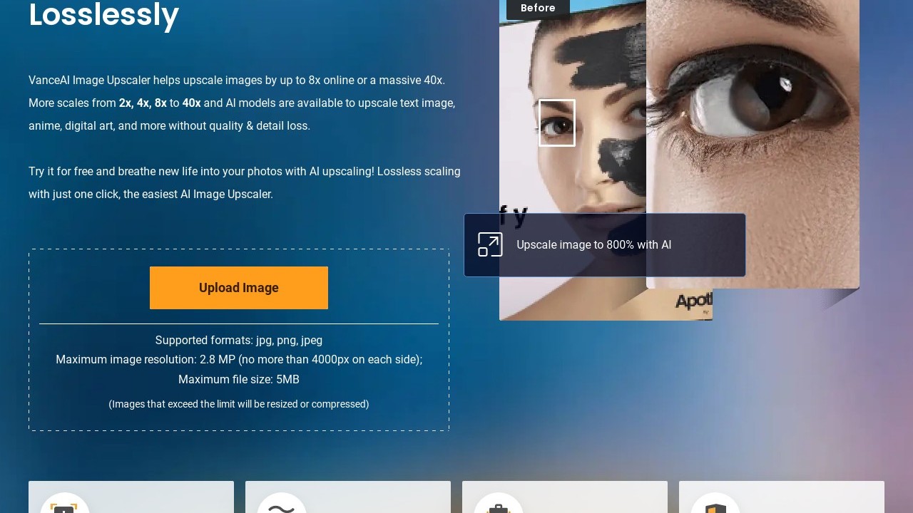 VanceAI Image Upscaler is a tool that utilizes deep learning to boost image size by up to 800% while enhancing resolution. It provides efficient AI-based upscaling within seconds, a variety of AI models for precise image enlargement, and secure data protection to ensure user privacy. This can be applied to marketplaces, car dealerships, printing, art images, blurry text, anime pictures, and more.