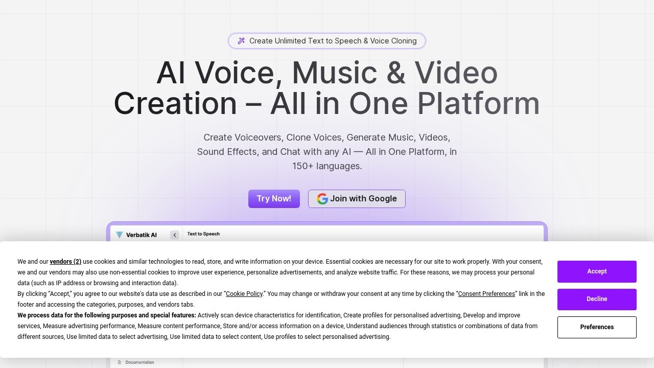 Verbatik Voice Cloning: AI-driven Text-to-Speech Production in 5 steps. Convert text into realistic speech using over 600 AI voices across 142 languages. Features include MP3 and WAV formats, emotion adjustments, unlimited edits, and commercial usage rights. Perfect for marketing, education, multimedia, customer service, voice commerce, and content creation. Plans vary from free trials to enterprise-level subscriptions. Boost content with SEO-optimized audio players. Easy Text-to-Speech editor, advanced sound studio, comprehensive SSML capabilities, and straightforward API integration. Verbatik provides a seamless and customizable solution for authentic text-to-speech transformation. Sign up for a free trial.