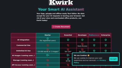 Kwirk is a cutting-edge office app offering a productivity toolset enhanced by AI. It includes a robust summarization tool capable of generating brief yet thorough summaries of any text. The app also features a logical block-based document management system and a personal AI coach that delivers instant feedback on your writing. Furthermore, Kwirk is compatible with all languages and file formats and provides translation services.