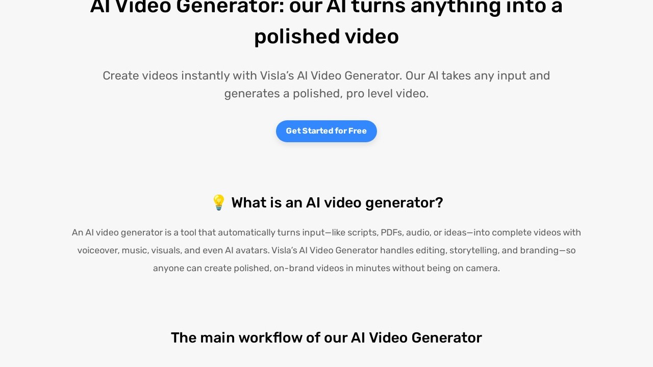 Visla is a tool for making and editing videos that enables users to swiftly and effortlessly craft engaging content. It offers AI-driven video generation which can create captivating narratives and visually appealing videos that connect with audiences. The platform also includes editing, recording, collaboration tools, and options for tailoring the tone and style of videos. Moreover, Visla offers auto-transcription, embedded videos, and auto-suggested footage, ideal for creating polished demos.