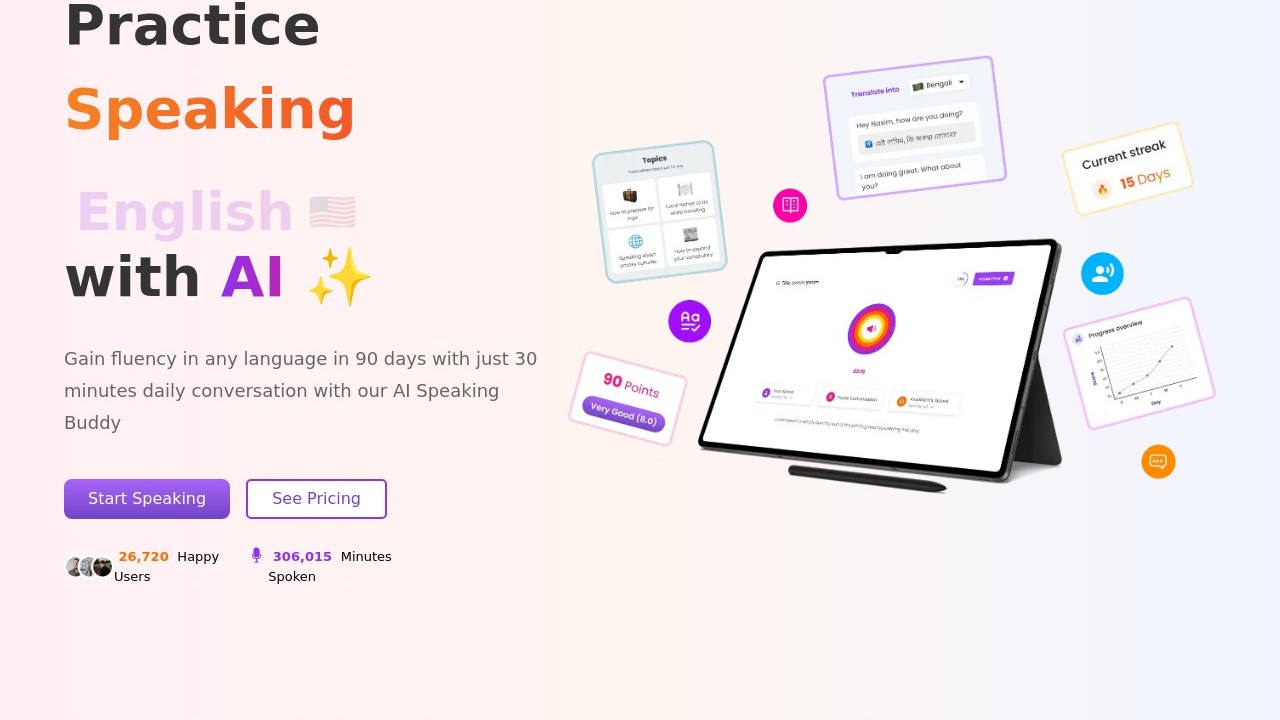 Vocalo is an AI-powered tool aimed at enhancing users' English speaking skills by engaging them in conversations with an artificial intelligence. It replicates realistic dialogues, enabling users to practice English speaking across different scenarios and subjects, thus boosting their fluency and confidence. Individuals may choose Vocalo to refine their pronunciation, broaden their vocabulary, and feel more at ease with conversational English without the stress of interacting with a human tutor, providing an easy and accessible path to language mastery.