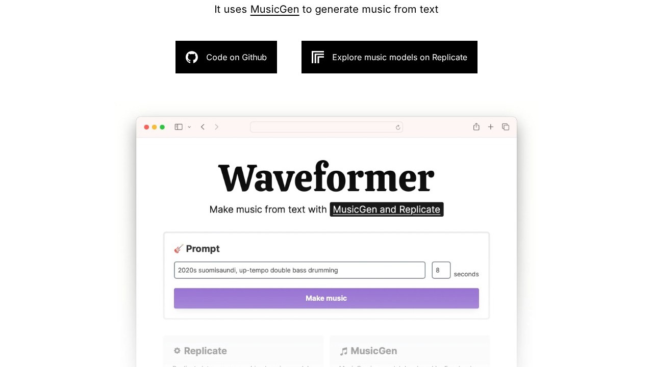 Replicate and MusicGen are tools that enable users to generate music from text through machine learning models. Replicate offers a platform for developing models with minimal coding requirements, whereas MusicGen is a model created by Facebook Research, trained on 20,000 hours of licensed music.