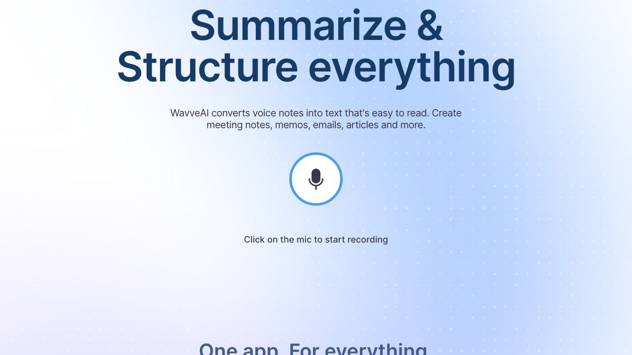 Wavve AI is a flexible tool crafted to transform spoken audio into well-organized, high-quality text summaries, aiding in the creation of meeting notes, memos, emails, articles, and more without the need for typing. It includes features such as quick speech-to-text conversion, application integration, language translation, content creation, and mood selection for setting the tone of summaries. Users may choose Wavve AI to streamline their workflow, boost productivity by decreasing manual typing, and effectively organize and share their ideas or meeting content in various formats and languages, all while tailoring the output to match the desired emotional tone.