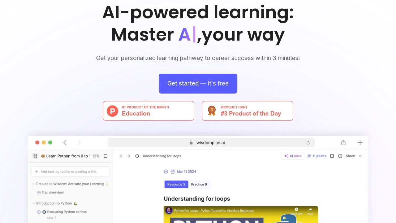 WisdomPlan is an AI-enabled educational tool that personalizes and enhances the learning journey. It aids in developing customized learning plans by smartly organizing, timing, and ordering educational materials from different sources. This tool is ideal for learners focusing on mastering particular skills and knowledge, offering functionalities like task segmentation, deadlines, alerts, note-taking, and progress monitoring. People may choose to use WisdomPlan to enjoy a learning experience tailored to their specific needs and preferences, supported by a community for resource sharing and feedback, all based on evidence-driven learning strategies.