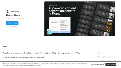 Contentinator is a Figma Community plugin offering AI-driven features for content generation, such as placeholder text, images, copywriting aid, and additional resources. It helps users save significant time by creating authentic content and data, high-resolution images, and providing diverse copywriting strategies.