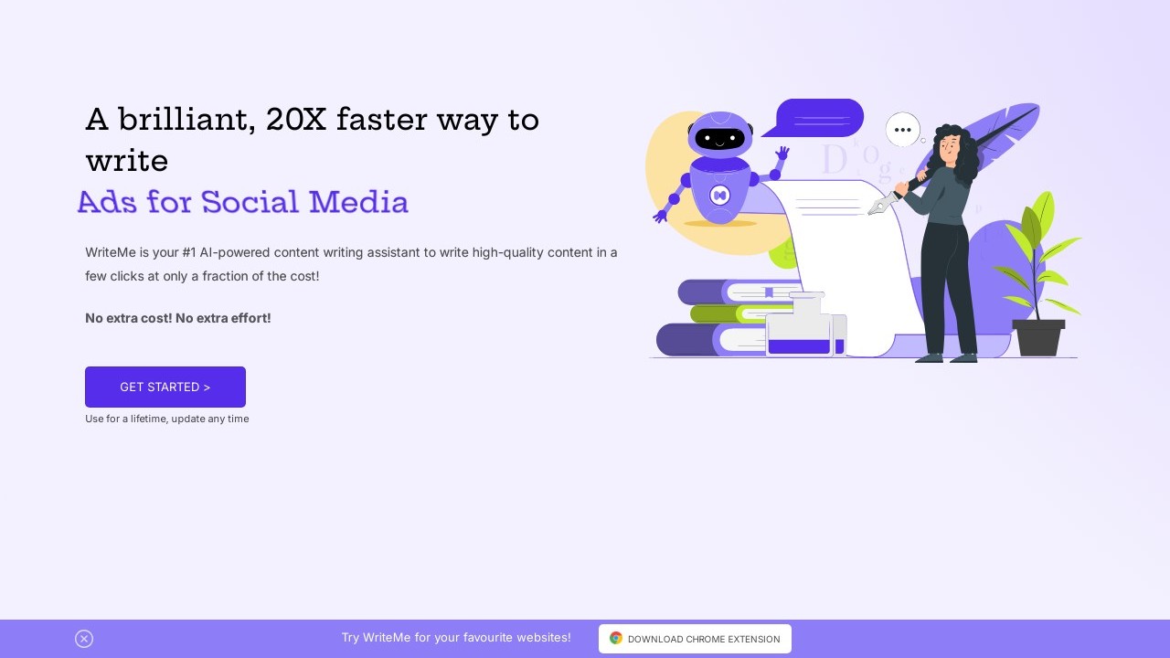 WriteMe.ai is an AI-powered writing tool designed to assist you in creating social media ads, captions, product descriptions, Fiverr gig information, Upwork proposals, and content for your blog.