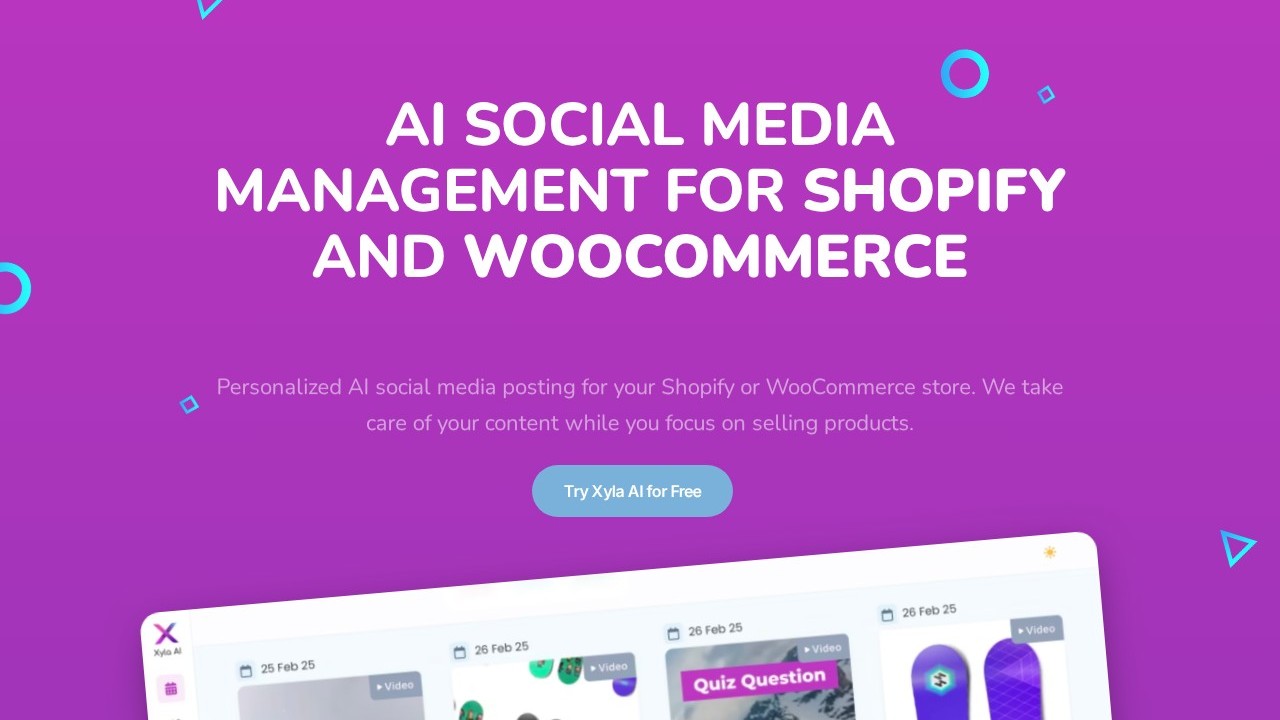 Xyla AI is a social media management tool driven by AI, tailored for e-commerce stores on Shopify and WooCommerce. It automates the process of content creation, scheduling, and posting on platforms like Instagram, Facebook, TikTok, Pinterest, and X. By seamlessly integrating with online stores to extract product data and generate a variety of content types—including product features, memes, and interactive quizzes—Xyla AI helps store owners sustain a consistent and engaging social media presence without the need for labor-intensive manual efforts. E-commerce businesses with constrained marketing resources opt for Xyla AI to save time, maintain posting consistency, diversify their content offerings, and extend their reach across multiple platforms, all while preserving brand-consistent messaging.