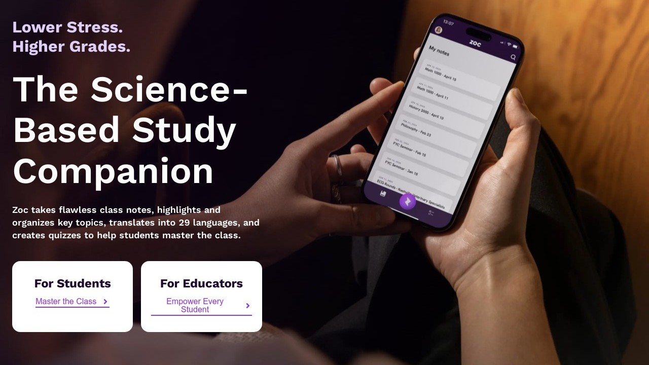 Zoc is an AI-driven study assistant created to help students excel in their courses. It accurately records lecture transcripts and arranges essential topics into digestible formats. The tool translates notes into 29 languages, ensuring accessibility for students from different backgrounds. Zoc produces quizzes to strengthen learning and adjusts to different difficulty levels, providing an interactive tutoring experience. It is supported by educational models such as Bloom's taxonomy, with the goal of boosting student engagement and performance. Zoc aids both students and teachers by improving focus, note-taking, and study effectiveness in various academic environments.